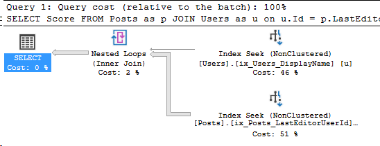 SET STATISTICS IO ON; SELECT Score FROM Posts as p JOIN Users as u on u.Id = p.LastEditorUserId WHERE u.DisplayName = 'Community' --The Community user in StackOverflow is an internal user, --so it has a lot of posts! /* (118119 rows affected) Table 'Posts'. Scan count 1, logical reads 267, physical reads 0, read-ahead reads 0, lob logical reads 0, lob physical reads 0, lob read-ahead reads 0. Table 'Users'. Scan count 1, logical reads 3, physical reads 0, read-ahead reads 0, lob logical reads 0, lob physical reads 0, lob read-ahead reads 0. */
