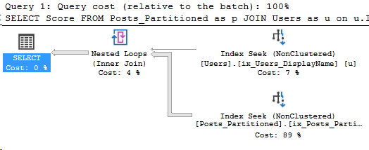 SELECT Score FROM Posts_Partitioned as p JOIN Users as u on u.Id = p.LastEditorUserId WHERE u.DisplayName = 'Community' /* (118119 rows affected) Table 'Posts_Partitioned'. Scan count 12, logical reads 391, physical reads 0, read-ahead reads 0, lob logical reads 0, lob physical reads 0, lob read-ahead reads 0. Table 'Users'. Scan count 1, logical reads 3, physical reads 0, read-ahead reads 0, lob logical reads 0, lob physical reads 0, lob read-ahead reads 0. */