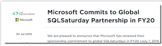 The recent blog post on PASS.org announces that Microsoft has renewed its sponsorship of SQLSaturday events. They are even, at the own discretion, sponsor individual events with more money and provide MS speakers.