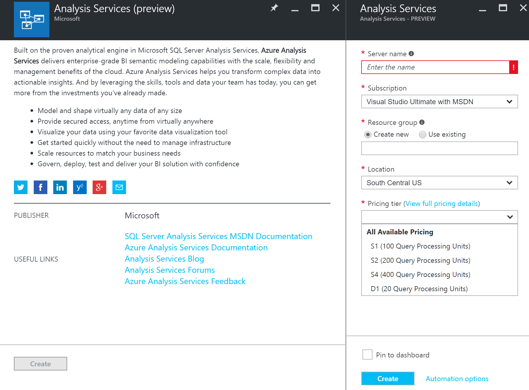 - Developers can create a server in seconds, choosing from the Developer (D1) or Standard (S1, S2, S4) service tiers. Each tier comes with fixed capacity in terms of query processing units and model cache. The developer tier (D1) supports up to 3GB model cache and the largest tier (S4) supports up to 100GB