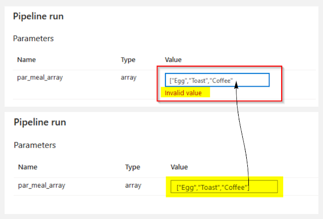 (2) In a similar way I can pass the same JSON text ["Egg","Toast","Coffee"] to a pipeline parameter before its execution. It even has its one automatic JSON validator and will notify me if my JSON is not valid, and this functionality is very nice!