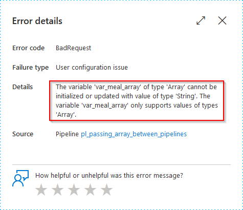 Then it will fail with an error message, "The variable of type 'Array' cannot be initialized or updated with value of type 'String'. The variable only supports values of types 'Array'.", when I try to execute this Set Variable activity in ADF.