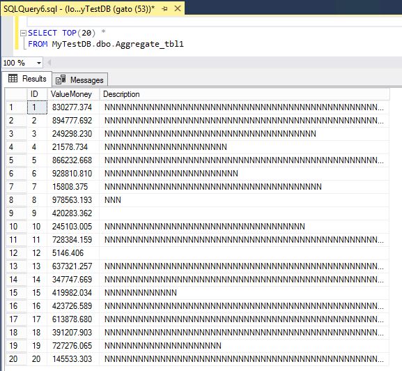 I have created a test table called Aggregate_tbl1 with over 12,000,000 rows of random "money" data and random texts as well, as you can see in the following images:
