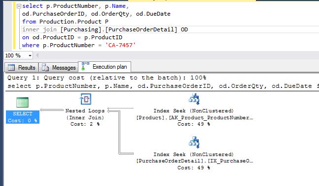 - The previous example was just for a simple select just for one table, and the performance is almost the same for both cases, but for the next example we can see the query execution is improved using index seeks instead of key lookups: