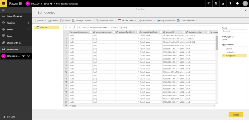 To use dataflows, in the Power BI Service, under a Workspace: Create – Dataflow – Add entities: This starts online Power Query and you then choose a connector from one of the many data sources (just like you do with Power Query in Power BI Desktop). Then choose a table to import and the screen will look like this:
