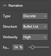 After this I just had to set visual attributes for this Narrative Science component. Where Type could have four different values (Discrete, Continuous, Percent of Whole, Scatterplot), Structure could take a form of Paragraph or a Bullet list, and Verbosity could be High, Medium and Low.