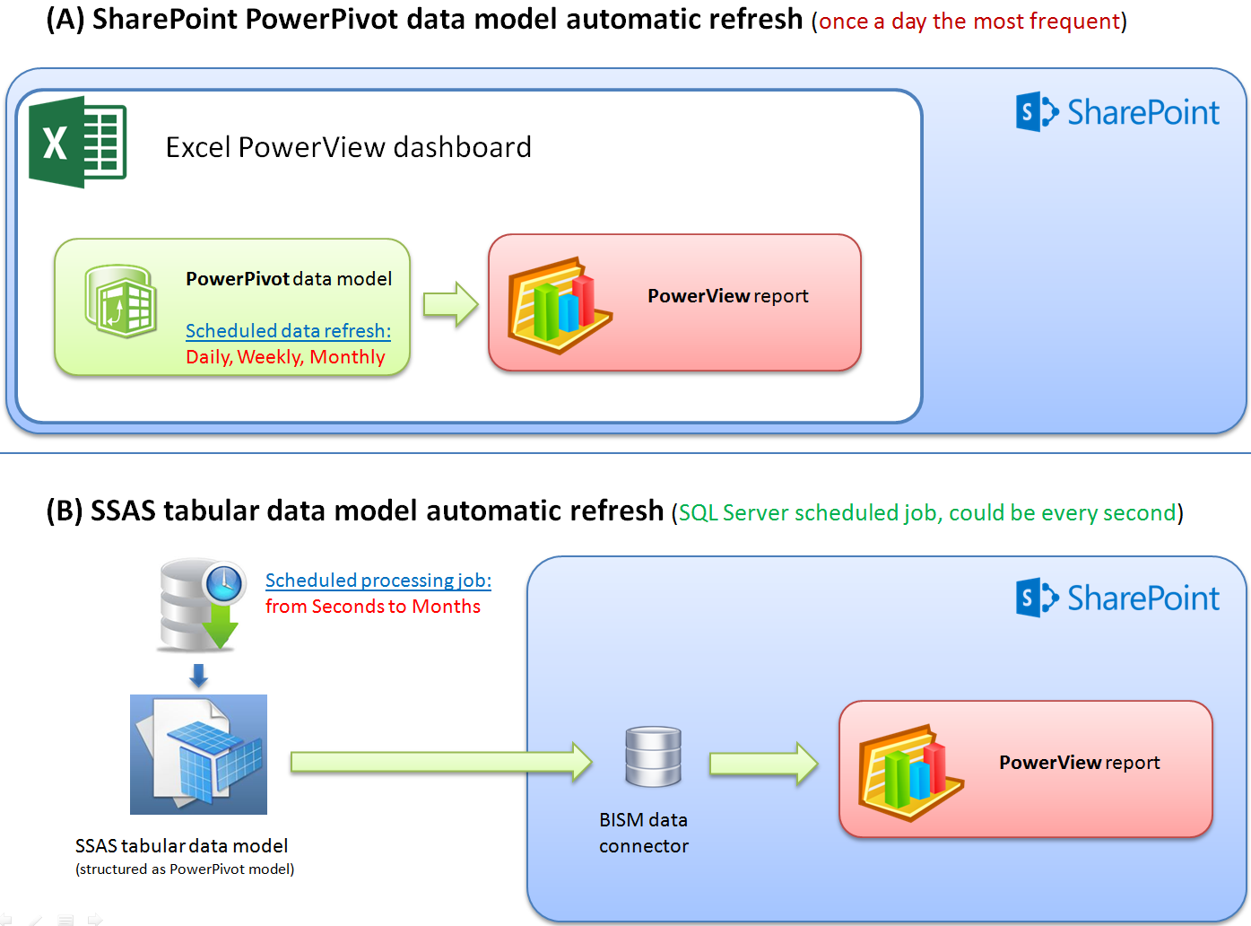 If a daily data refresh is sufficient for business users reports than we can use out of box feature of SharePoint, however if more granular time intervals for PowerPivot model data refresh are required that we can: