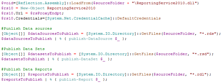 After my long trials and tribulations to build a single script that would do all the steps of SSRS reports deployment in a single run were over, then the main section of my script looked this way: