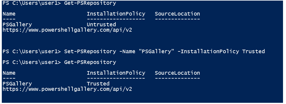 Next I checked and it was now registered as an Un-Trusted source. Either I would need to add the -Force parameter to the Import-Module command or it will prompt me to confirm if I trust the source.