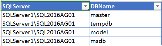 Send-SQLDataToExcel -Connection "Server=SQLServer1SQL2016AG01;Trusted_Connection=True;" -MsSQLserver -SQL "select @@servername SQLServer, name DBName from sys.databases" -AutoSize -BoldTopRow -FreezeTopRow -TableName Test -TableStyle "Light13" -WorkSheetname Test -Path sc.xlsx