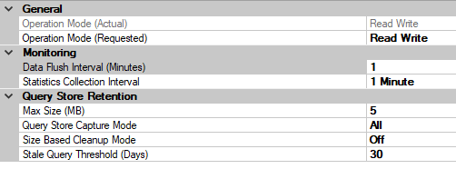 There’s a couple settings you can change to control the Query Store size. First, you want to set the Query Capture Mode to Auto, especially if you have an ad-hoc workload. There’s a great post by Erik Darling on BrentOzar.com about this setting. In summary, I recommend Auto to control the speed at which the Query Store grows.