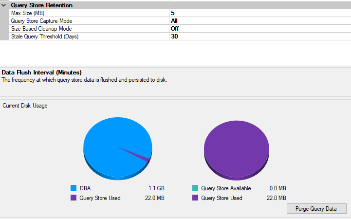 ALTER DATABASE [DBA] SET QUERY_STORE (MAX_STORAGE_SIZE_MB = 100);