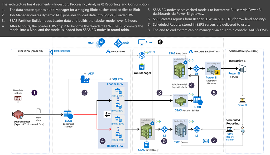 This reference architecture is focused solely on reporting, for those use cases where you will have a lot of users building dashboards via Power BI and operational reports via SSRS. You can certainly expand the capabilities to add more features such as machine learning as well as enhancing the purpose of certain products, such as using Azure SQL Data Warehouse (SQL DW) to accept large ad-hoc queries from users. The reference architecture is also for a batch-type environment (i.e. loading data every hour) and not a real-time environment (i.e. handling thousands of events per second).