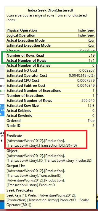 The above numbers imply that Index seek operator's seek predicate ( "ProductID = 801" ) filtered 519 rows. The additional filter " "TransactionID % 3 = 0" filtered it further to 171 rows.
