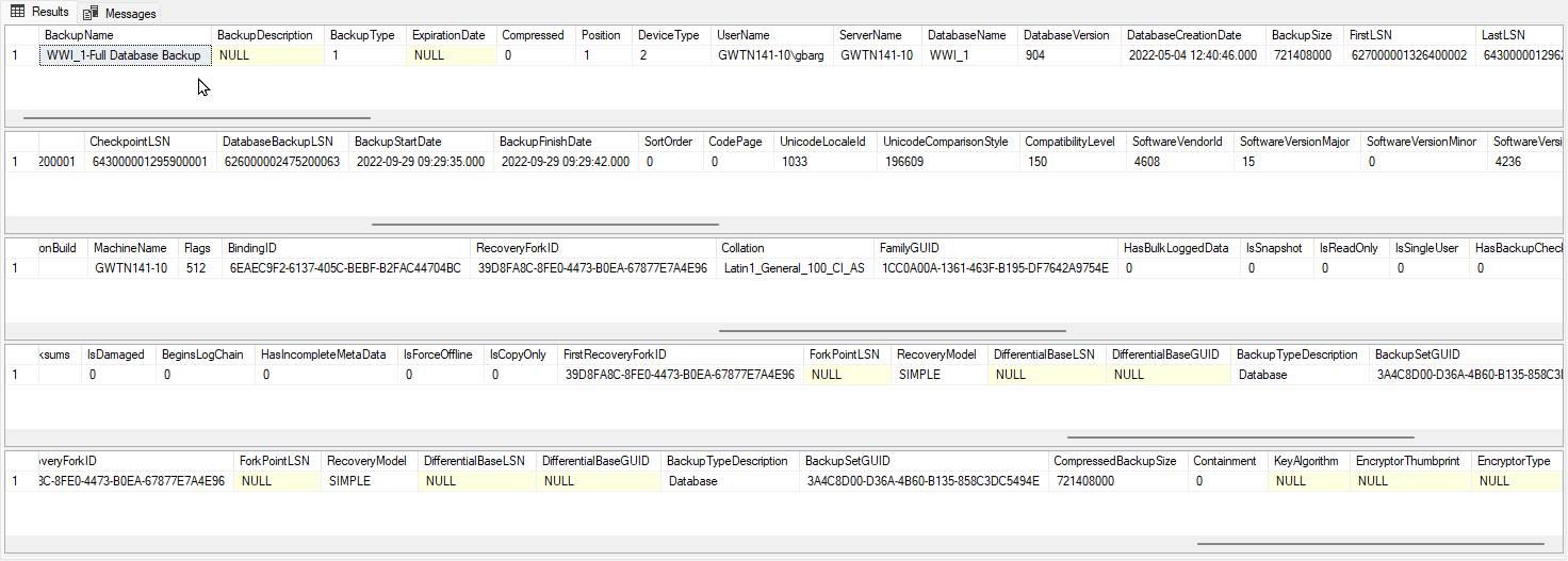 RESTORE HEADERONLY FROM DISK = 'C:Program FilesMicrosoft SQL ServerMSSQL15.MSSQLSERVERMSSQLBackupWhatInTheWorldIsInThisFile.bak'