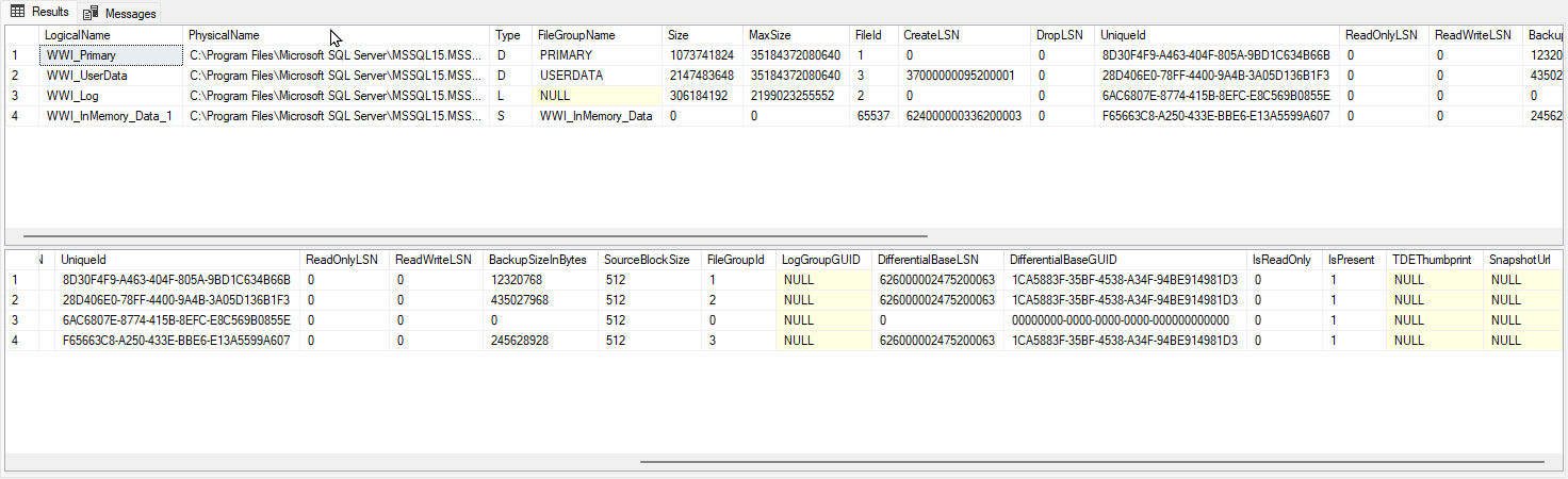 RESTORE FILELISTONLY FROM DISK = 'C:Program FilesMicrosoft SQL ServerMSSQL15.MSSQLSERVERMSSQLBackupWhatInTheWorldIsInThisFile.bak'