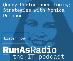 How do you keep your SQL queries fast? Richard chats with Monica Rathbun about her approaches to SQL Server query tuning. Monica starts with defining the problem – how do we know that the database is the performance bottleneck? The conversation dives into measuring query performance and the power of Query Store, but only on SQL Server 2016 and above, so get upgrading! Entity Framework is a standard tool for developers to automate access to SQL. Still, it can generate some pretty ugly queries, and Monica talks about different ways to improve them, including the old standby of writing a stored procedure. Lots of ideas for folks struggling to make their databases go fast!