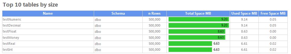 And again, with the default parameters for each data type, we can see the storage used by each one, so is always important to know your data, investigate the numbers to be stored in your database so you can optimize space usage.
