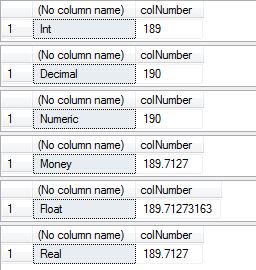 Again we create one table for each data type to check (since for numbers there are a lot of parameters and various subtypes, we will only check the most common with the defaults): Int, Decimal, Numeric, Money (exact types) and Real, Float (approximate types).