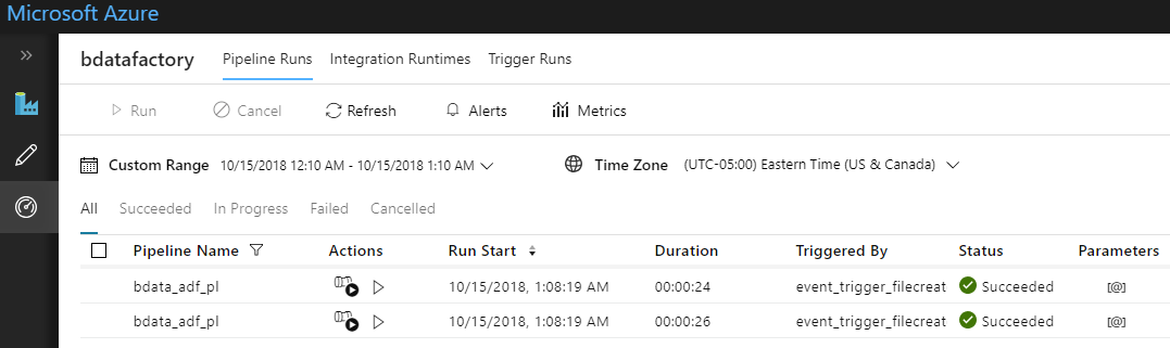 And once this all being done, I place two different data files into by Blob storage container and ADF Pipeline trigger successfully executes the same pipeline twice to load data into two separate tables: