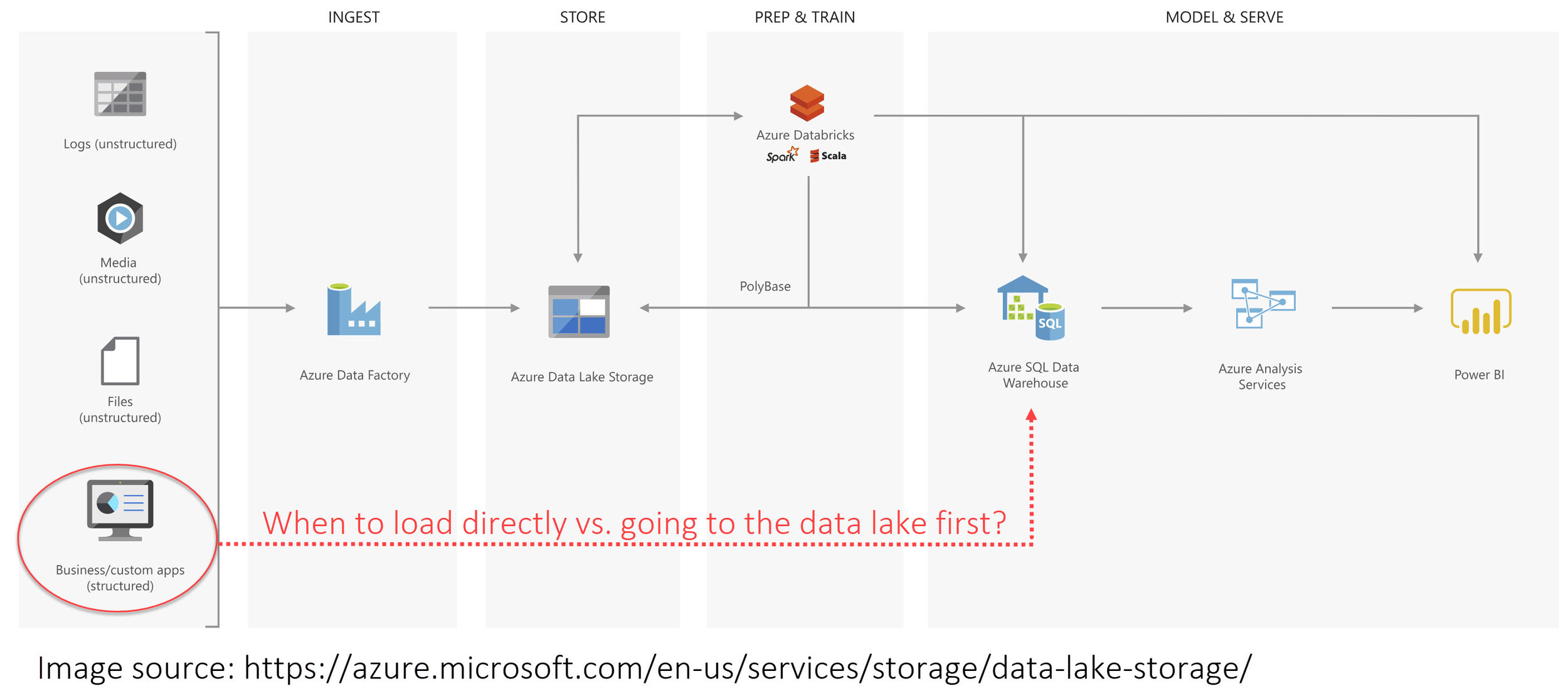 With data lakes becoming very popular, a common question I have been hearing often from customers is, “Should I load structured/relational data into my data lake?”. I talked about this a while back in my blog post What is a data lake? and will expand on it in this blog. Melissa Coates also talked about this recently, and I used her graphic below to illustrate: