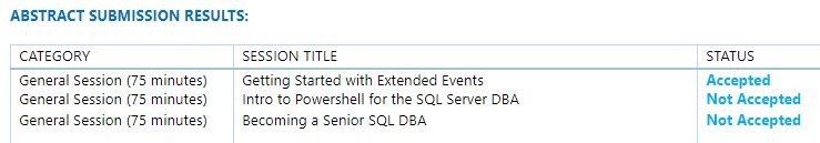 I found out a few days ago that one of my sessions was selected for Summit this Fall - I will be presenting an updated version of my "Getting Started with Extended Events" session that I have been working at SQL Saturdays over the last couple years.