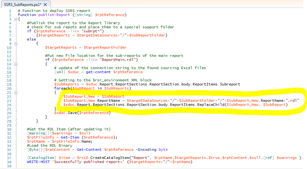 # update of the connection string to the found sourcing Excel files [xml] $xdoc = get-content $rptReference # Getting to the $rsr_environment XML block $SubReports= $xdoc.Report.ReportSections.ReportSection.body.ReportItems.Subreport foreach($SubReport in$SubReports) $SubReport_New= $SubReport $SubReport_New.ReportName =$targetDataSources+"/"+$SubReportFolder+"/"+$SubReport_New.ReportName+".rdl" $xdoc.Report.ReportSections.ReportSection.body.ReportItems.ReplaceChild($SubReport_New,$SubReport) $xdoc.Save($rptReference)