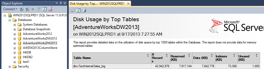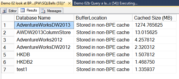SELECT DB_NAME(database_id) AS [Database Name] , case is_in_bpool_extension when 1 then 'Stored in BPE' when 0 then 'Stored in non-BPE cache' ,COUNT(*) * 8/1024.0 AS [Cached Size (MB)] FROM sys.dm_os_buffer_descriptors GROUP BY DB_NAME(database_id), is_in_bpool_extension ORDER BY [Cached Size (MB)] DESCOPTION (RECOMPILE); I then ran the following query to load up as much data as possible.