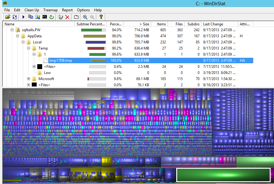 In order to catch this bug I then ran WinDirStat. Looking under my C:\Users\SQLBALLS.PW\AppData\Local\Temp\1 folder I found this.