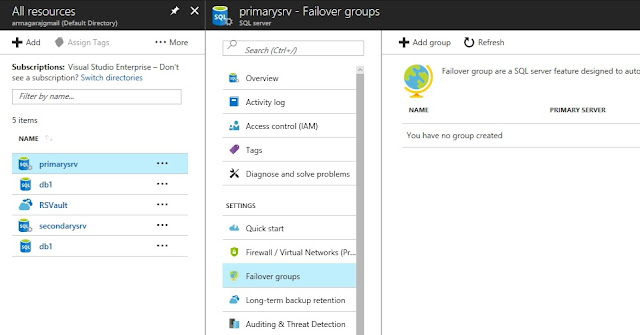 *Β Click on the primary server ( not database ) and select failover groups