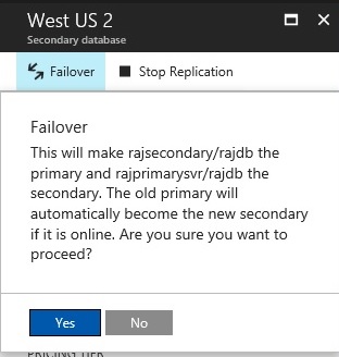 Few important things to know This failover is like a DB Mirroring failover. This means application will need to change their connection strings to secondary server upon failover. Unlike, Always on Availability groups, azure geo replication explained above, doesn't support transparent application failover. However, Azure Failover Groups (right now in preview) allows transparent failover for applications. More about that on next post 🙂