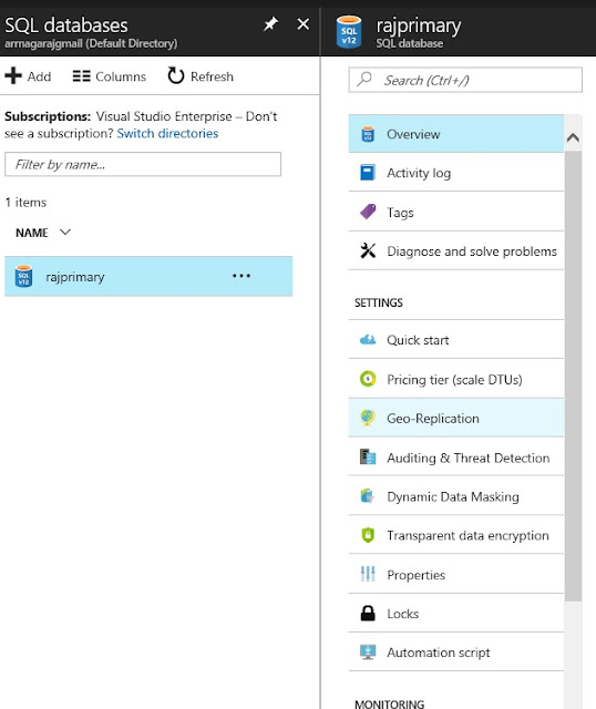 Dear all,I have taken the azure dive at last 🙂 In case if you are new to azure, azure is the Microsoft cloud platform service, offering lots of services for handling data platform tasks. There are tons and tons of material on it and perhaps you can get a good introduction on the following links - here and here This post is about SQL Azure Database - a service (a PAAS service ) which allows one to host just a database in cloud and a feature of it called "active secondary". "Geo Replication" - Active Secondary is a feature in SQL Azure in premium service tier ( similar to our enterprise edition but certainly not as costly 🙂 ), which synchronizes data asynchronously to another server (either in the same geographical location or different ) and allows one to run read only queries to it.