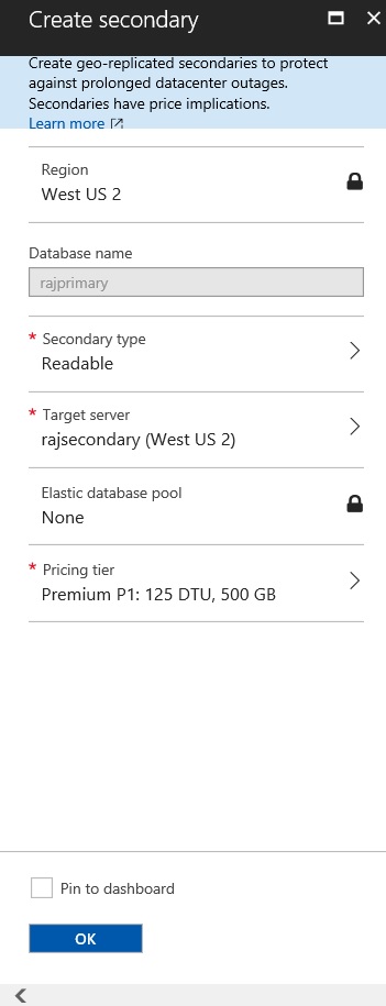 9) Create a secondary server similar to primary, by providing details like servername and admin login name