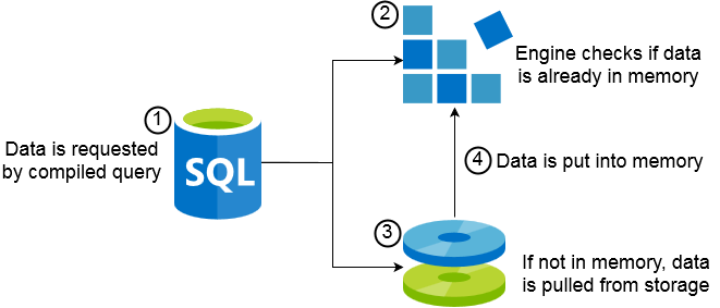 When a request is made the engine checks if the data is already cached in memory (or buffer pool), if the data is already available, then it is returned. If the data is not available, then it is retrieved from storage and put into memory until the buffer pool is full.
