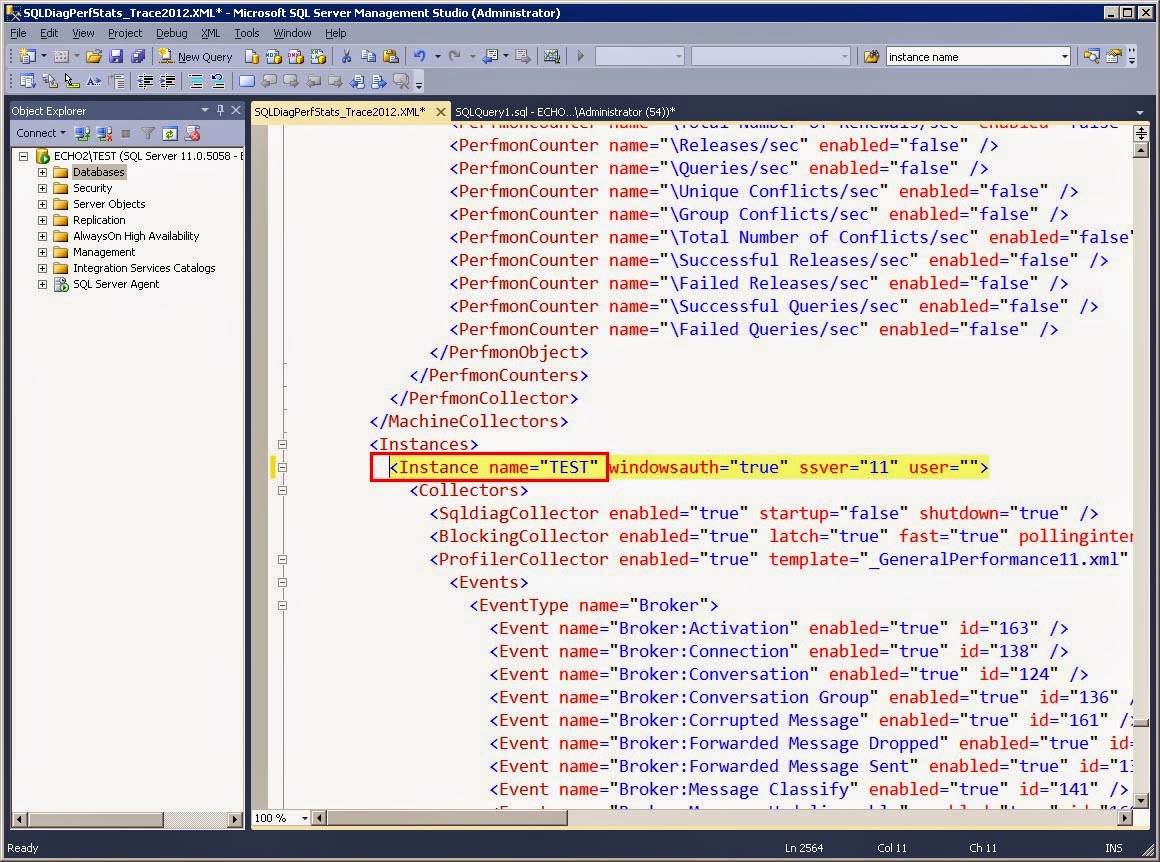 By default, the data collectors will capture only a subset of perfmon counters and SQL trace events, and it will do that for ALL instances on the server being monitored. If you need to add or remove certain counters or monitor only a specific SQL Server instance, then you will need to edit the SQLDiagPerfStats_Trace2012.XML configuration file. You can open the file in Notepad, but opening it in SQL Server Management Studio color codes it and make everything easier to read.