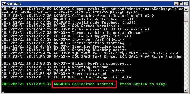 To monitor our server, copy the PerfStatsScript2012 subfolder to the SQL Server. This folder cannot be on a network drive; it must be local to that server. It’s best if you do not place it on the C drive or on a drive that hosts your transaction log (LDF) files. The data collector can quickly capture a lot of data, so you want to avoid filling up the C drive or impacting the write performance of your transaction log files. Open a command prompt to that folder location and run StartSQLDiagTrace2012.cmd. SQLDiag will start up the collectors based on what’s in the XML configuration file. Once you see the green line that says “SQLDIAG Collection started”, then you can try to reproduce your performance problem on the server.