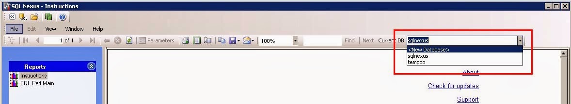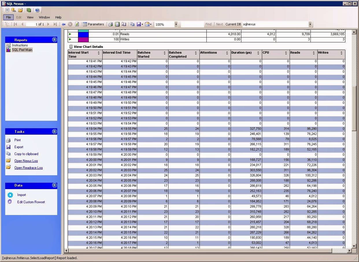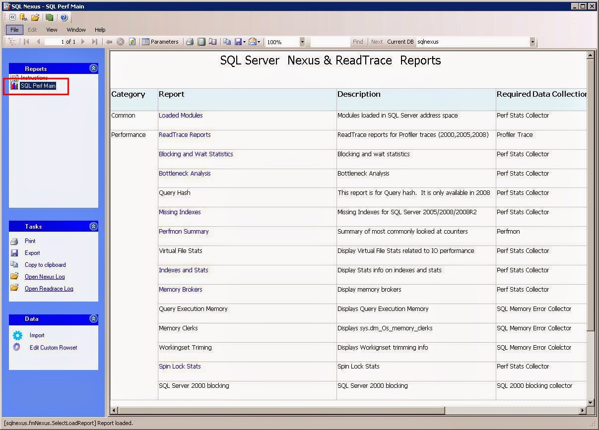 Now just close the Data Import window. In the SQL Nexus window, click SQL Perf Main from the upper left hand pane. This is main page where we will drill into the various reports.
