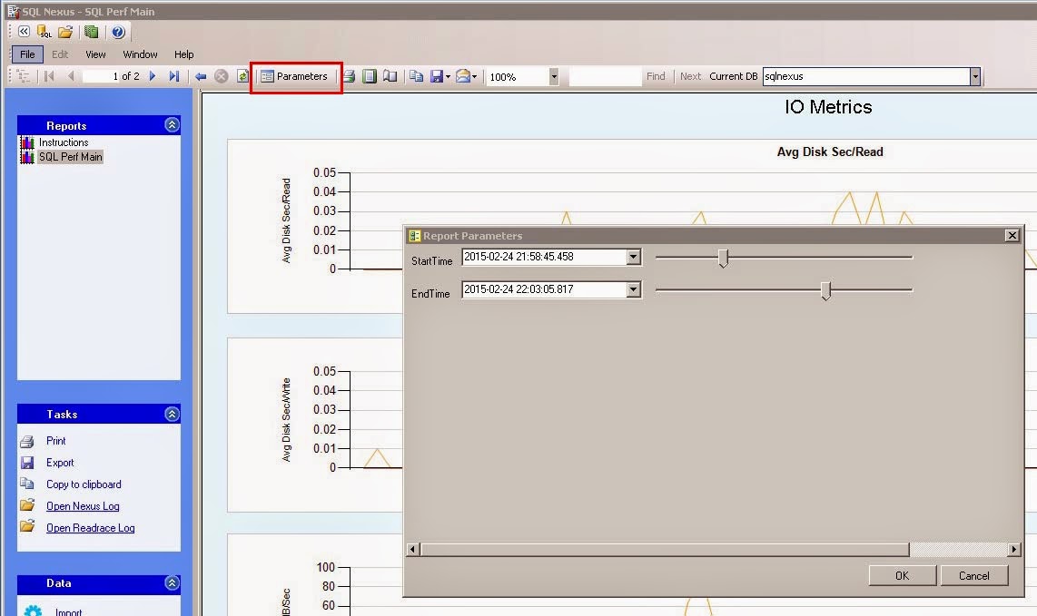 Report Parameters is another feature that people tend to overlook. When viewing a report, such as the IO Metrics, click Parameters button on the toolbar. In the popup window, you can change the start and end timeframe that you want to view. This is extremely helpful if your data spans hours or even days.