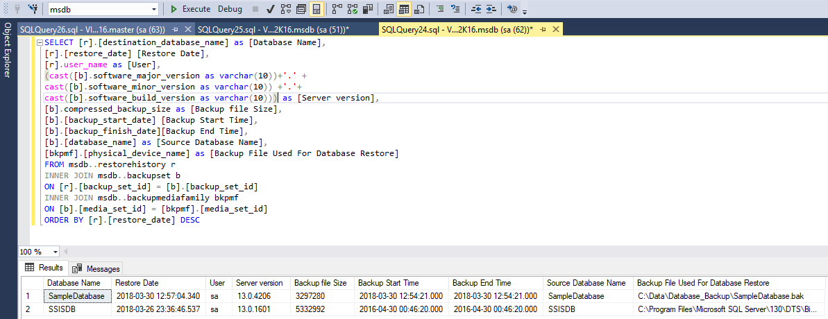 Now if we take another backup with the different name as "SampleDatabase_1.bak" on the same location and tried to restore the database again, then one more entry for the Sampledatbase will come on the execution of the SQL query for getting Database restoration history as shown in below images