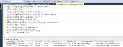 Now if we take another backup with the different name as "SampleDatabase_1.bak" on the same location and tried to restore the database again, then one more entry for the Sampledatbase will come on the execution of the SQL query for getting Database restoration history as shown in below images