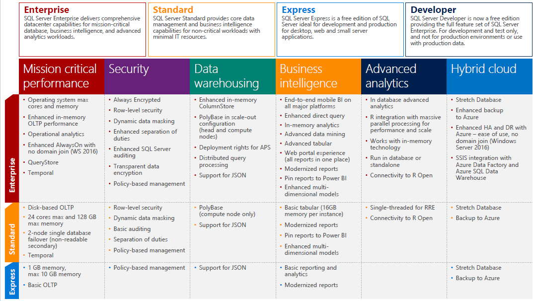 Today is the day: SQL Server 2016 is available for download!  You can download all the versions (enterprise, standard, web, express with advanced services, express, developer) of SQL Server 2016 now if you have a MSDN subscription, and you can also create an Azure VM right now that includes SQL Server pre-installed with one of the versions (enterprise, standard, web, express).  Lastly, you can also experience the full features through the free evaluation edition (180 days) or the developer edition (you have to sign in to Visual Studio Dev Essentials, a free developer program, before you can download the developer edition).