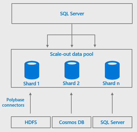 SQL Server 2019 big data clusters with enhancements to PolyBase act as a virtual data layer to integrate structured and unstructured data from across the entire data estate (SQL Server, Azure SQL Database, Azure SQL Data Warehouse, Azure Cosmos DB, MySQL, PostgreSQL, MongoDB, Oracle, Teradata, HDFS, Blob Storage, Azure Data Lake Store) using familiar programming frameworks and data analysis tools:
