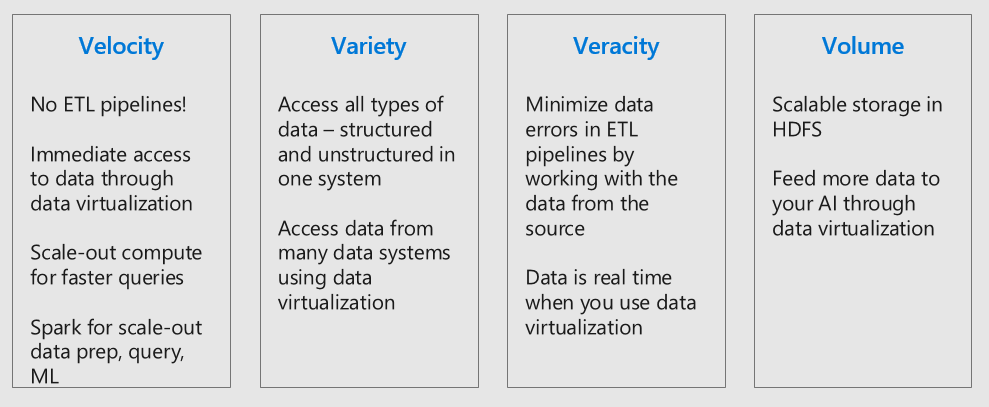 In summary, SQL Server 2019 Big Data Clusters improves the 4 V’s of Big Data with these features: