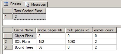 COUNT(*) AS 'Total Cached Plans' FROM sys.dm_exec_cached_plans; FROM sys.dm_os_memory_cache_counters WHERE name IN ('Object Plans','SQL Plans','Bound Trees'); GO