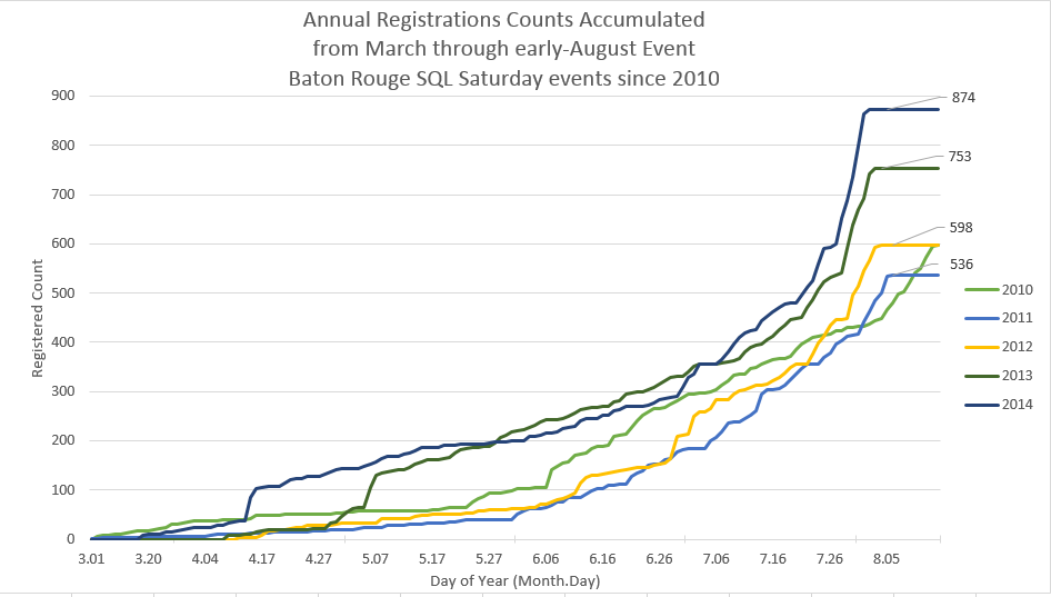 Here's the final numbers on some of the business intelligence we worked up using registration data from the last five years of Baton Rouge SQL Saturday events, which includes all but our first year of the event in Baton Rouge in 2009.