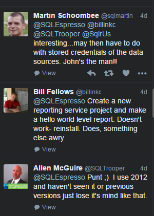 I love getting get a laptop, but getting all the software reinstalled and making sure everything works can be trying. Last week, I was lucky enough to get a new one and spent two days getting it setup just right. At least so I thought…. once I started working on it of course, BAM I hit my first road block. Visual Studio using SQL Server Data Tool will not render any reports in the Preview tab.