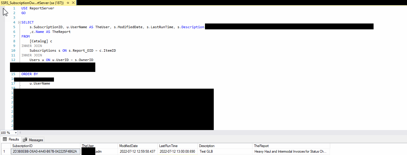 USE ReportServer GO SELECT s.SubscriptionID, u.UserName AS TheUser, s.ModifiedDate, s.LastRunTime, s.[Description] ,c.[Name] AS TheReport FROM [Catalog] c INNER JOIN Subscriptions s ON s.Report_OID = c.ItemID INNER JOIN Users u ON u.UserID = s.OwnerID ORDER BY u.UserName /* -- Update OwnerID for existing subscriptions DECLARE @OldUserID uniqueidentifier DECLARE @NewUserID uniqueidentifier SELECT @OldUserID = UserID FROM dbo.Users WHERE UserName = 'Domainadm' SELECT @NewUserID = UserID FROM dbo.Users WHERE UserName = 'Domainemailaccount' UPDATE dbo.Subscriptions SET OwnerID = @NewUserID WHERE OwnerID = @OldUserID AND SubscriptionID = '3E42B6FD-9B21-4977-AE63-82D5C86D344F' */