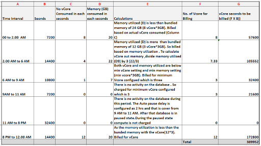 - Each vCore in action provides 3GB memory. If the workload uses more memory than the memory bundled with the vCore, billing will be based on the memory. For example, for a specific time interval, the load on the database is using 2 vCore and 10 GB memory. In this case, billing will be based on the memory as the memory utilization is above 6 GB (2vCore*3 GB). To derive the number vCore to be billed from the memory utilization, memory utilized will be divided by 3 (3GB for each Vcore). In our case, it will be billed for 10GB/3 = 3.33 vCore. The below table gives you a better understanding of the billing. Let us consider one database, that is provisioned with 3 vCore as minimum vCore and 16 as maximum vCore.The auto pause delay is configured as 2 hrs. Each vCore seconds is charged at 0.000145