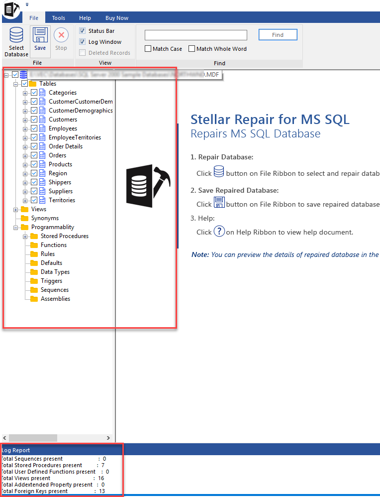 A left pane object explorer shows a tree map of all the database objects in the repaired database. You also have the functionality of being selective in your export/save of objects by check boxing the needed table(s). You can also directly view records in the tables to verify the consistency and data quality.