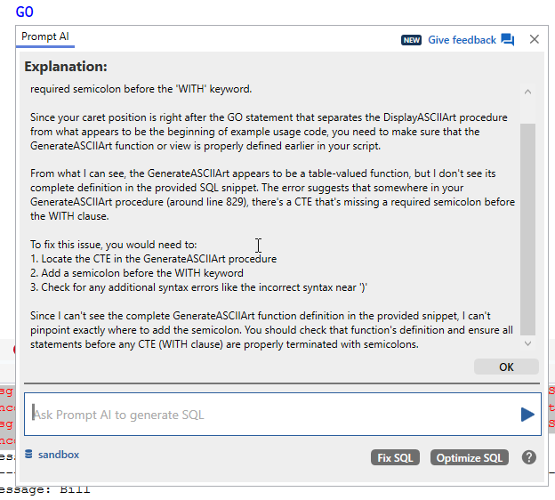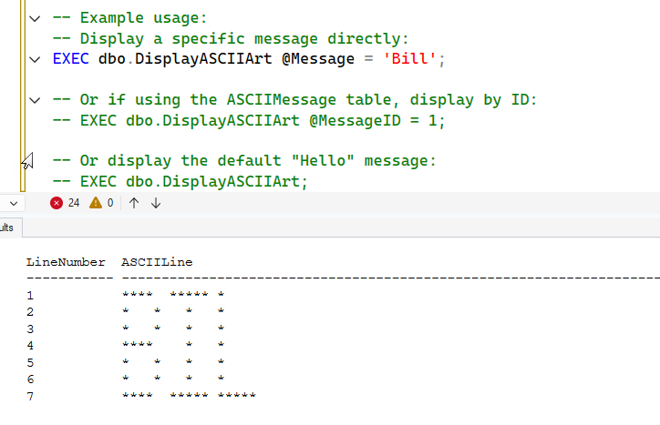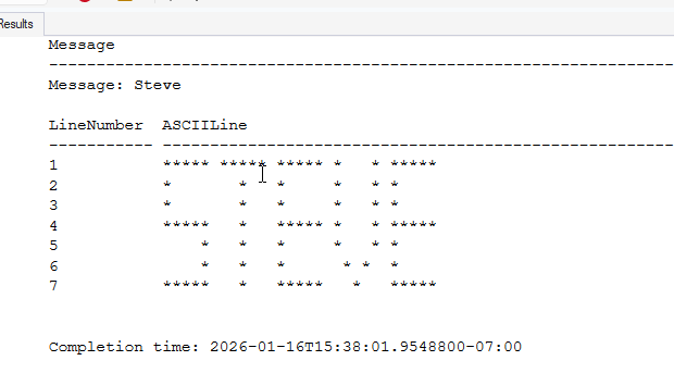 My first instinct is to use Claude first, but here I decided to ask SQL Prompt AI for help. I generically asked for a function that would take a word as a parameter and then produce ASCII Art. I ended up with a function and a procedure. I won’t show all the code, but I ended up with this result.